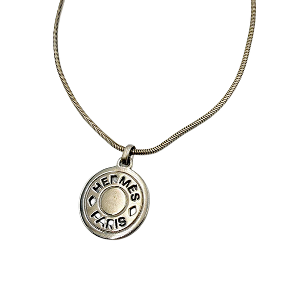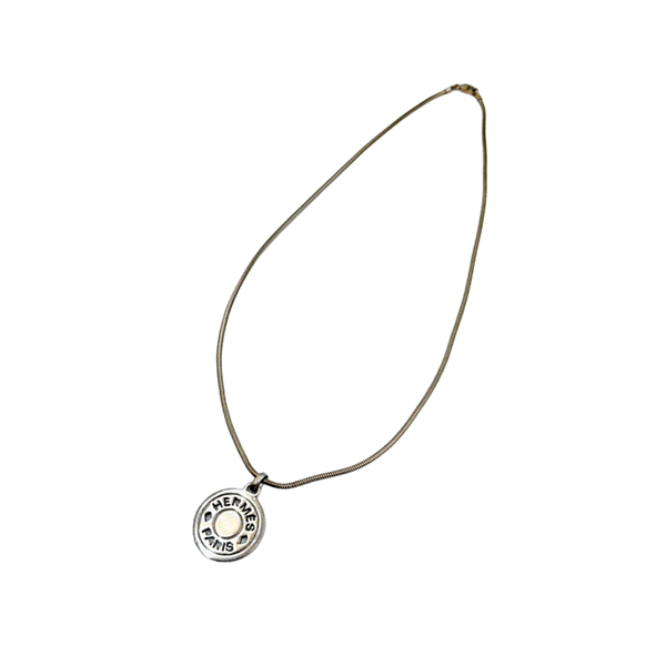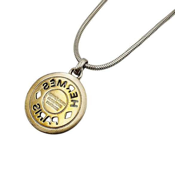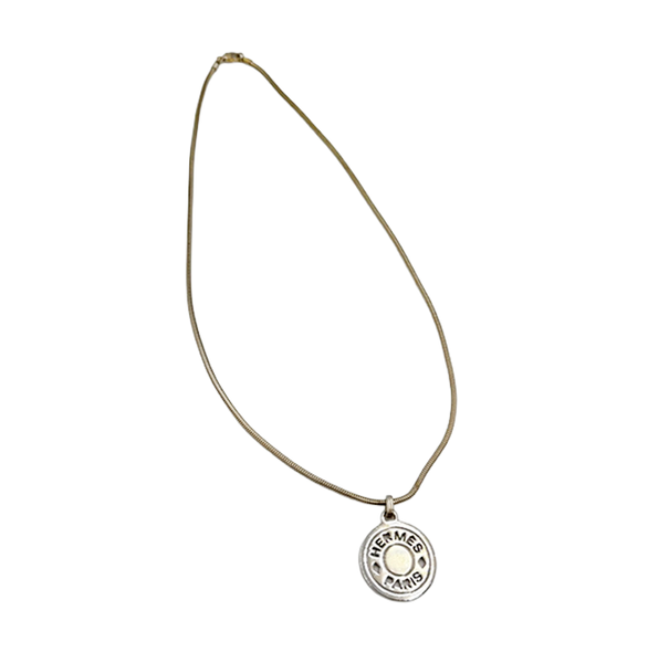 HERMES(エルメス)のセリエネックレスです。 ブランドを象徴するセリエモチーフが印象的で、 シンプルながらも高級感あふれるデザイン。 シルバートップとゴールドチェーンのコンビが上品で、 コーディネートにさりげないアクセントをプラスしてくれます。 カジュアルからきれいめまで幅広く活躍するアイテムです。 変色有。