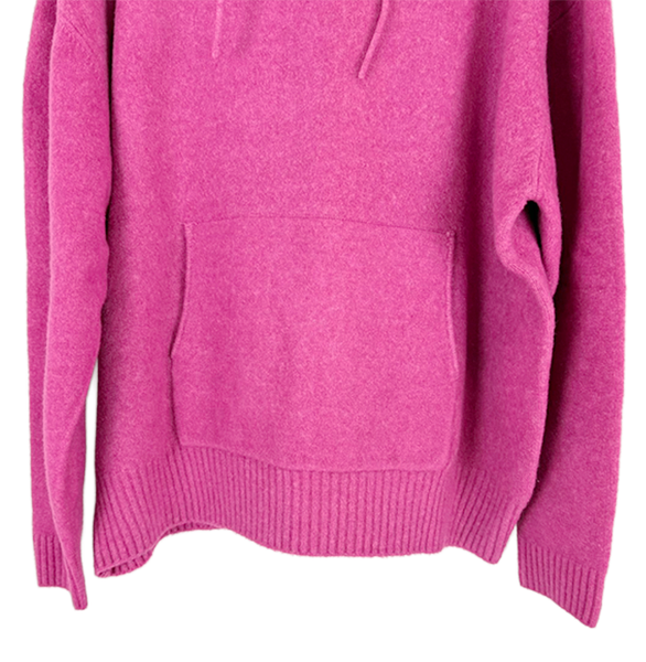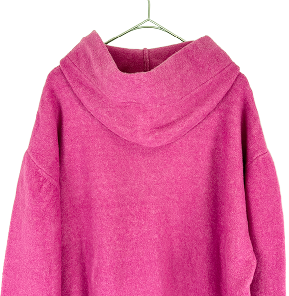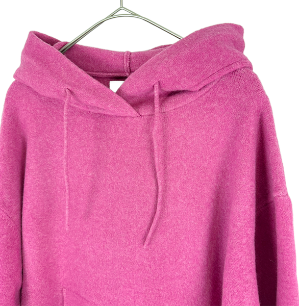 鮮やかなピンクカラーがコーディネートの主役になるニットフーディ。 柔らかな肌触りで着心地がよくリラックス感がありながら程よくきれいめな印象に。 多少の毛羽立がございますが、まだまだご使用いただける商品です。
