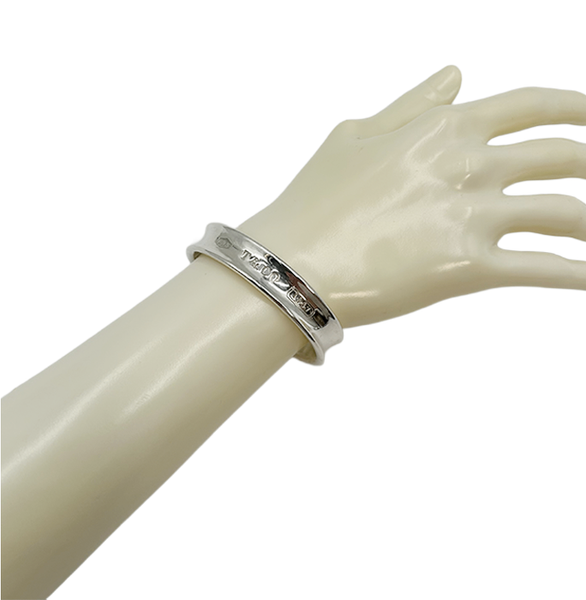 ティファニーを代表するシンプルで洗練されたデザインのナローバングルです。 スターリングシルバーならではの上品な輝きが手元を美しく見せ、流行に左右されず長くお使いいただけます。 オープンタイプのため着脱しやすく、ほどよいフィット感で日常使いにも取り入れやすいアイテムです。 全体的に使用感は少なく、目立つ汚れは見られません。 中古品のため細かなスレや小傷についてはご了承ください。