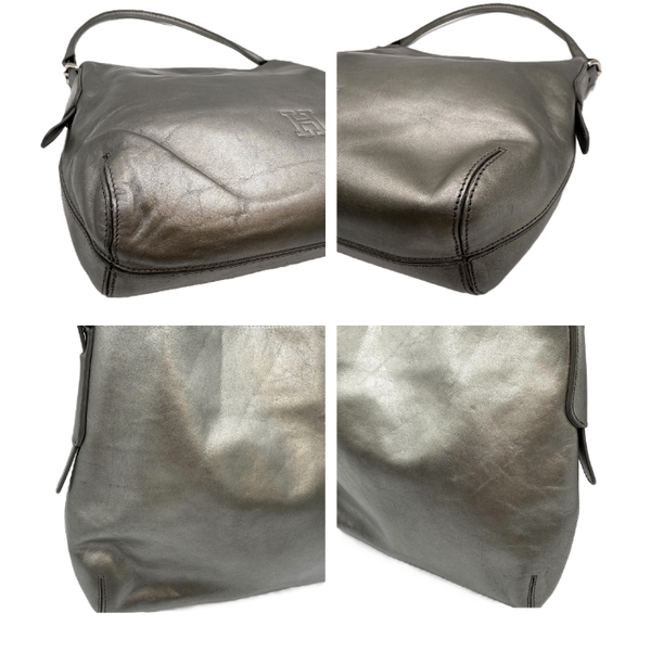 シルバー系カラーのショルダーバッグです。程よいメタリック感で持ちやすいデザイン。 シワ、傷、凹み跡が若干ありますが、気になる汚れはなくまだまだご使用いただけるお品物です。