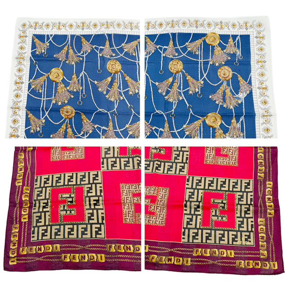 FENDI(フェンディ)とLongchamp(ロンシャン)のハンカチをまとめた 4点セット です。 フェンディらしいチェーン柄やロゴデザイン、ロンシャンの華やかなペイズリー柄など、ブランドの個性を楽しめるアソート内容。 カラーやデザインにバリエーションがあり、普段使いはもちろん、バッグのアクセントやコレクションにもおすすめ。 目立つ汚れはなく、全体的に良好なコンディションです。