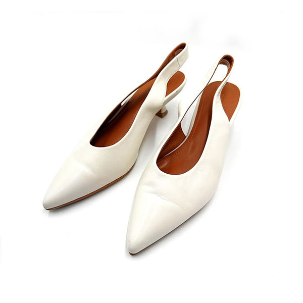 ポインテッドトゥで綺麗なシルエットのバックスリングパンプスです。 使用感は少なめですが、シワ、つま先、かかとの削れ、黒い擦れ汚れが少々あります。 目立つ汚れはなく、まだまだご使用いただけるお品物です。