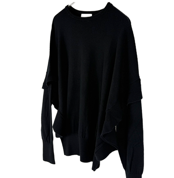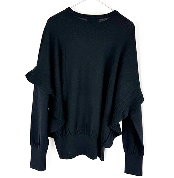 腕分部のフリルデザインが映えるニットトップス。 甘さを程よくプラスしたディティールが、シンプルながらも女性らしい 印象を演出します。1枚で主役になるデザインなので、 ボトムスを選ばず上品なスタイリングが楽しめます。 多少の毛羽立がございますが、まだまだご使用いただける商品です。
