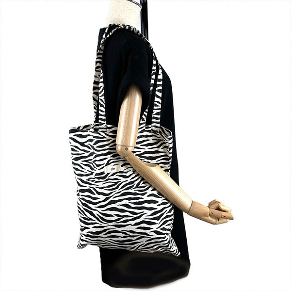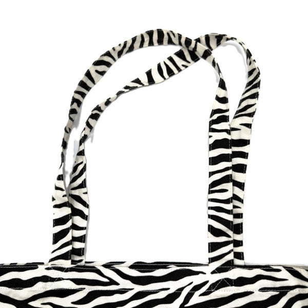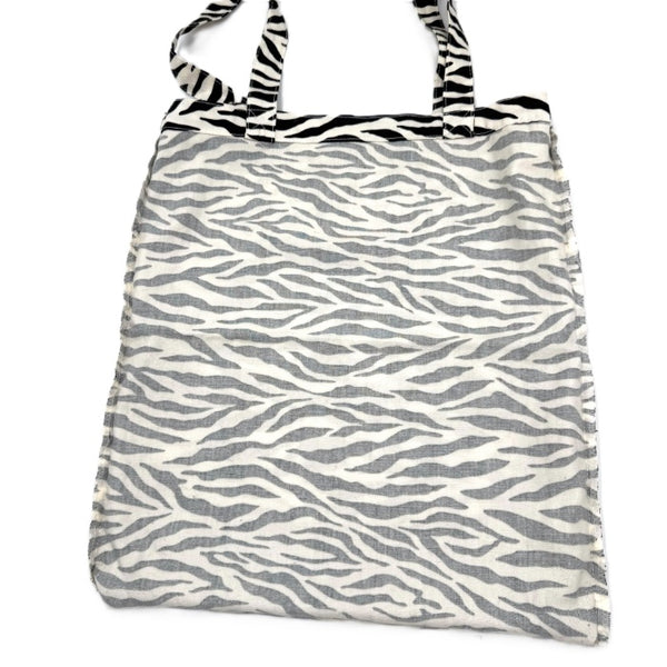 畳んで持ち歩ける使いやすいゼブラ柄エコバッグです。 使用感が少しあり、うっすら黄ばみ、ハンドルや入口にくすみ汚れがあります。 目立つ汚れや傷みはなくまだまだご使用いただけるお品物です。