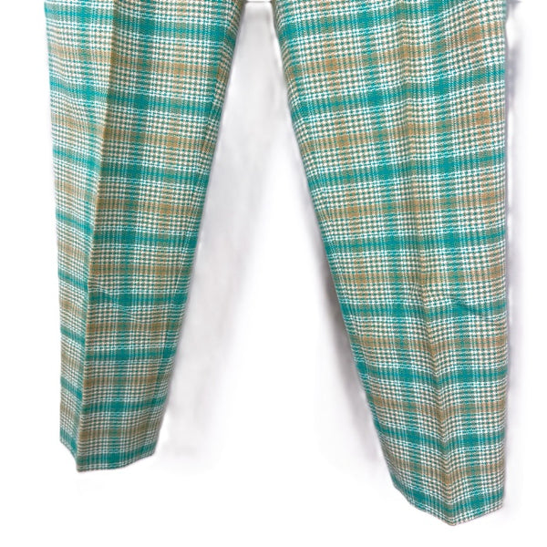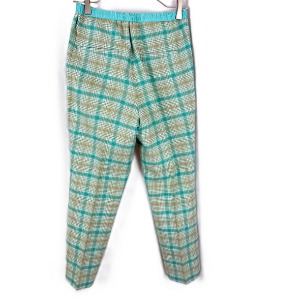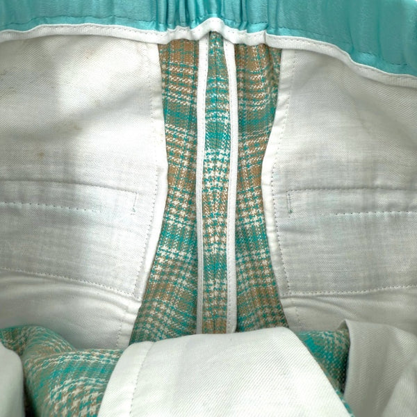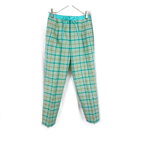 綺麗なシルエットのチェック柄パンツです。ウエストゴム入り。裏地はありません。 毛羽立ちが少々、ウエスト内側にうっすら汚れがあります。表面に気になる汚れなどなく全体的に状態の良い綺麗なお品物です。