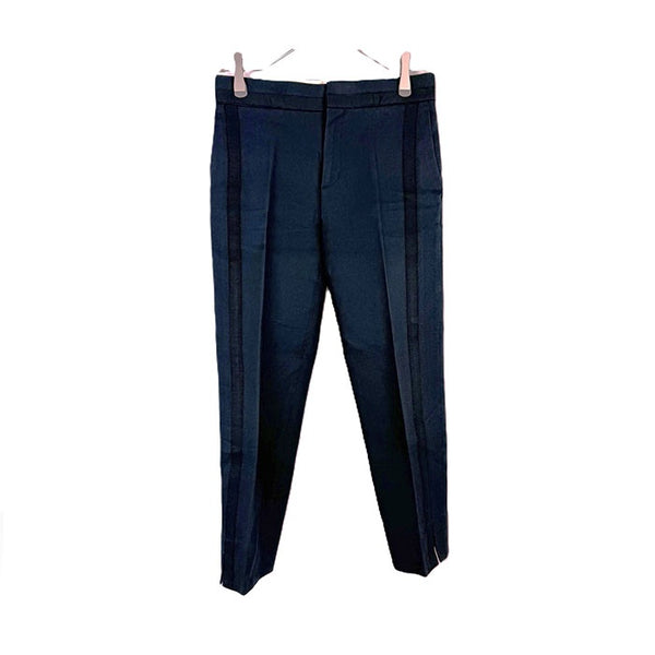 ウエストとサイドにテープラインが入った綺麗なシルエットのテーパードパンツです。 ポケットや裾、折り目などにうっすら色褪せ、シワが少々ありますが、気になる汚れなどなく全体的に綺麗なお品物です。