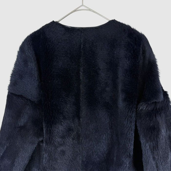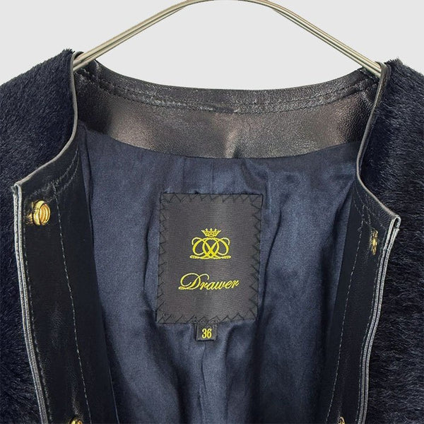 Drawer(ドゥロワー)のファージャケットです。 上質なファー素材に、レザー(牛革・羊革)を組み合わせた高級感あふれる一着。 ノーカラーデザインにスナップボタン仕様で、 カジュアルにもきれいめにも合わせやすいバランスの取れたデザインです。 目立つ汚れなく綺麗なお品です。