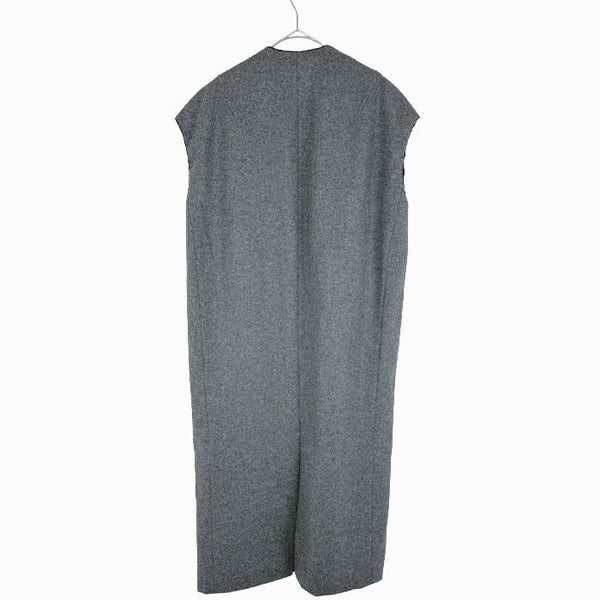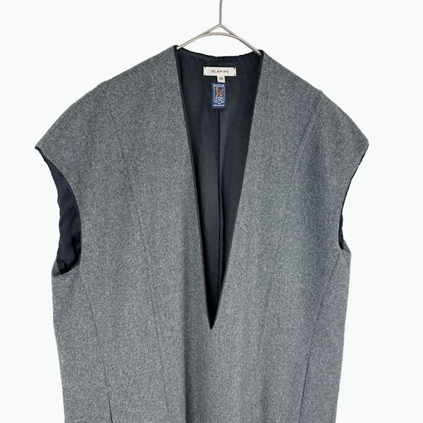 BLAMINK(ブラミンク)のノースリーブワンピースです。 深めに入ったVネックが印象的で、ミニマルながらも洗練された雰囲気の一着。 上質なウール素材を使用し、落ち感のある美しいシルエットが魅力です。 一枚ではもちろん、インナーやアウターとのレイヤード次第でロングシーズン着用可能。 (※元々は長袖の商品でしたがノースリーブにリメイクしてあります。)