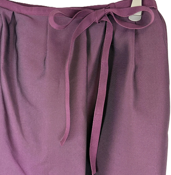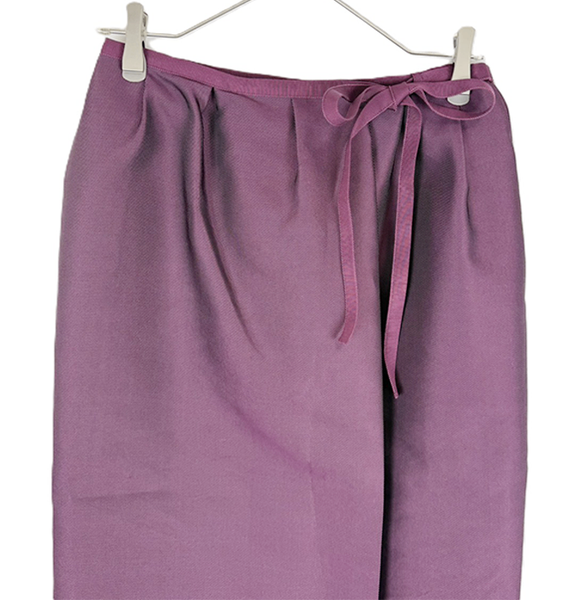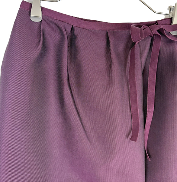 フロントはラップ風デザインになっており、動いたときにほんのり揺れるシルエットが上品。 ウエスト部分は軽くギャザーを寄せ、細めのリボン紐でサイズ調整も可能です。 普段使いはもちろん、きれいめトップスと合わせればお出かけスタイルにもぴったり。 目立つ汚れもなく綺麗なお品です。