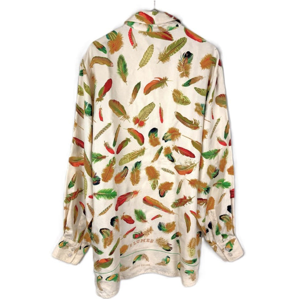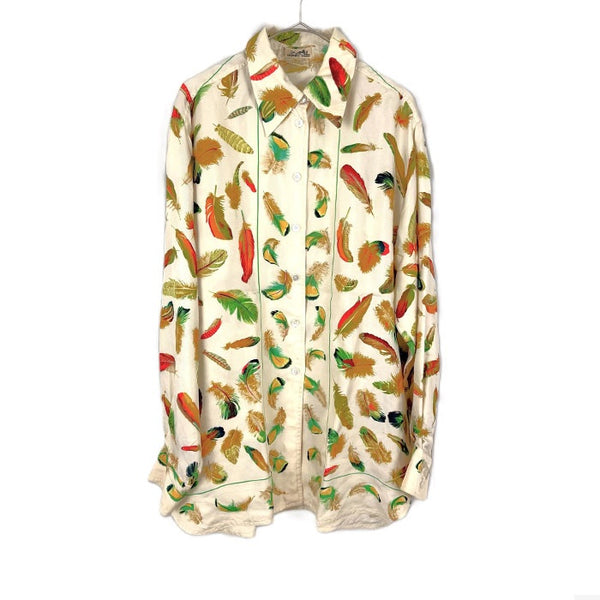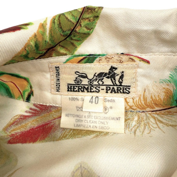 【中古】エルメス HERMES シルクブラウス PLUMES 長袖 羽 フェザー柄 上質 アイボリー ブラウン系 i0627aq011220
