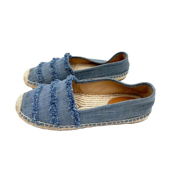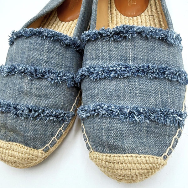 デニムフリンジデザインのエスパドリーユスリッポンですい。箱付き。 使用感が少々あり、うっすら黄ばみ箇所あり、履き口歪み、インソールにうっすら汚れがあります。 どれも目立つものではなく、全体的に綺麗なお品物です。