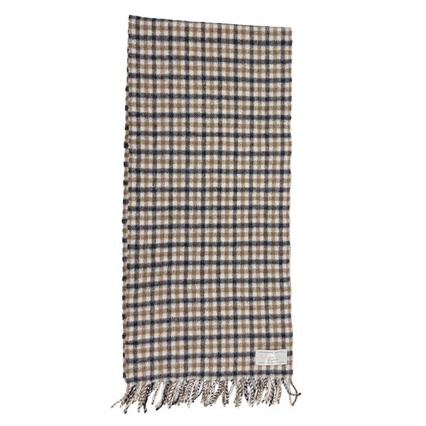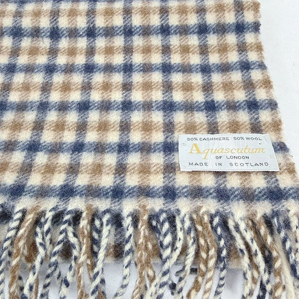 上質なカシミヤとウールを50%ずつ使用した贅沢なマフラーです。 スコットランド製ならではの丁寧な織りとふんわりとした暖かさが魅力で、 軽やかに巻けるのにしっかり保温してくれます。 ベージュとブルーを基調にした柔らかなチェック柄は、性別を問わず使いやすく、 冬のコーディネートに優しいアクセントを添えてくれます。 気になる汚れや傷みはなく、全体的に綺麗なお品物です。