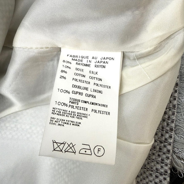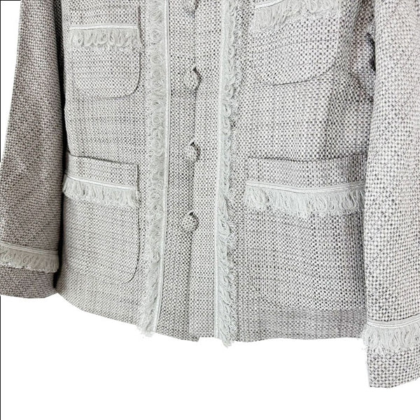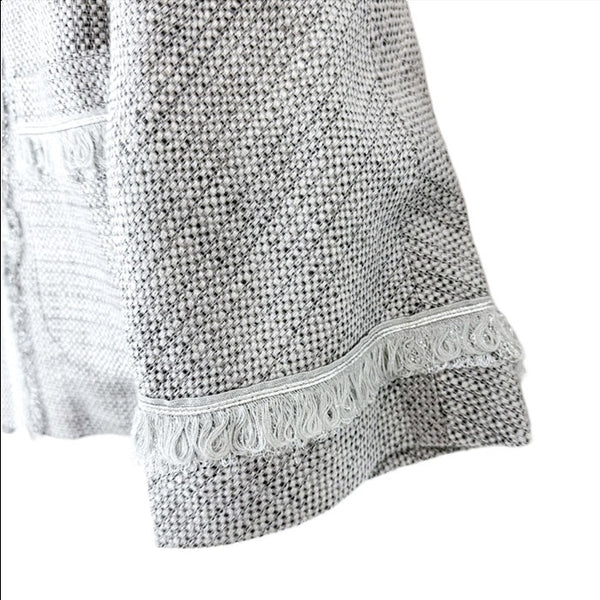軽やかなグレーのミックスツイードが高級感を演出し、セレモニーやフォーマルシーンにもぴったり。 フロントのくるみボタンやポケットのディテールまで丁寧に仕立てられた、華やかさと上品さを兼ね備えた一着です。 フリンジにほつれあり