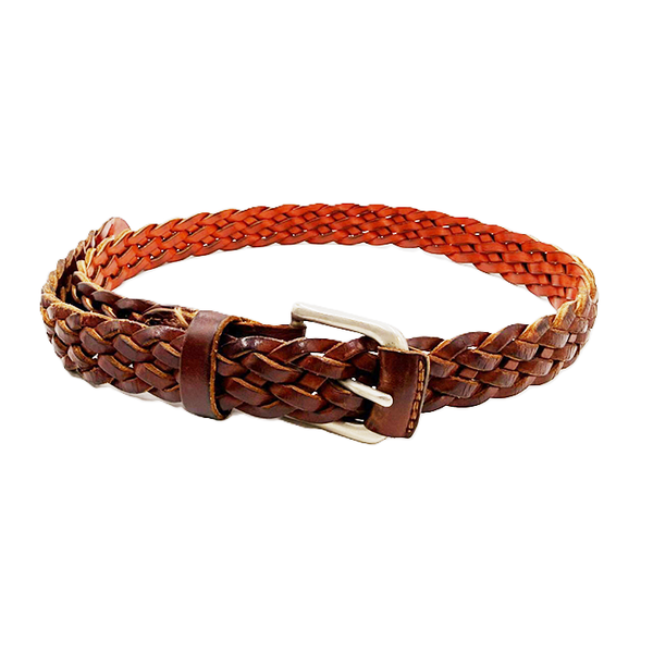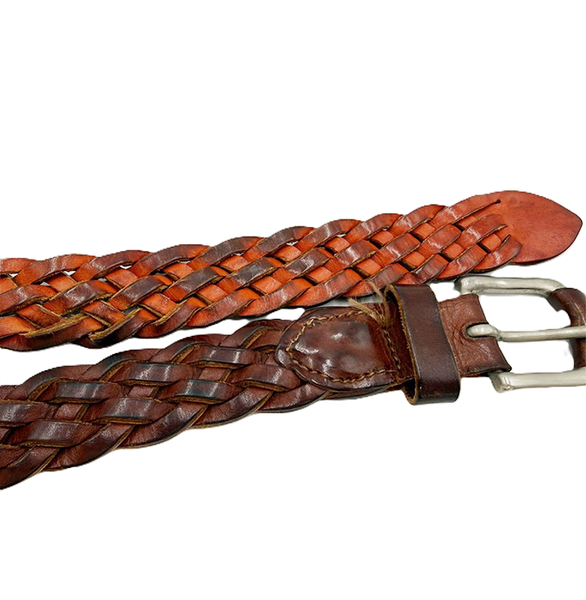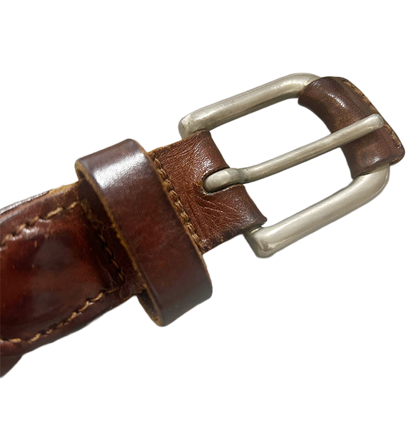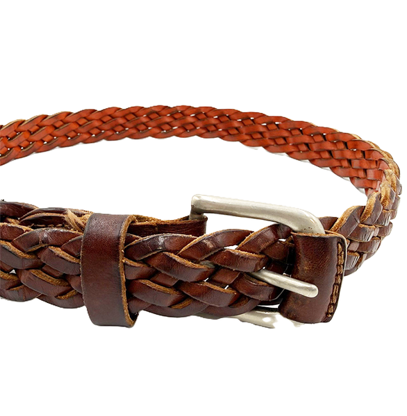 編込みデザインにシルバーのバックルがアクセントのレザーベルト。 カジュアルからキレイ目スタイルまで幅広いスタイルにマッチ。 多少の使用感はありますが、まだまだご使用いただけます。