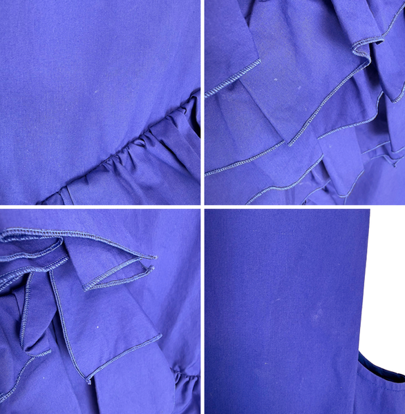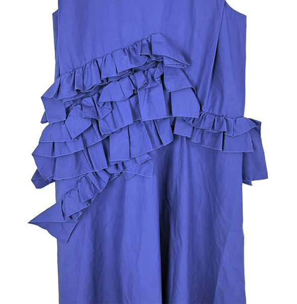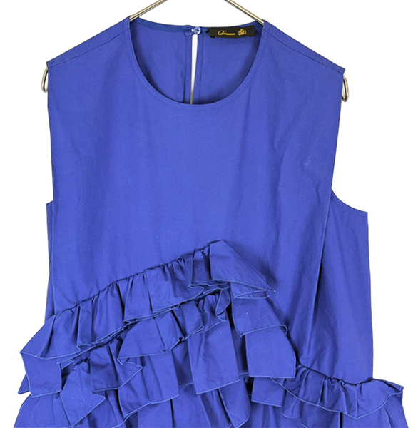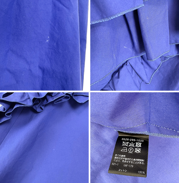 鮮やかなブルーカラーに大胆なフリルデザインが特徴的で、存在感のある一着。 立体的なディテールが華やかさを演出し、コーディネートの主役になるアイテムです。 シンプルなシルエットに個性的なデザインが映え、パーティーやお出かけにもおすすめ◎ 一部テカリ・シミがございますが、目立つものではなくまだまだご使用いただけるお品物です。