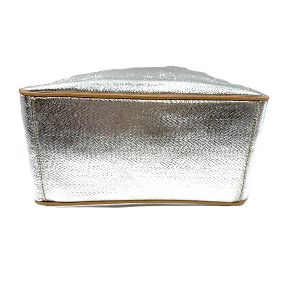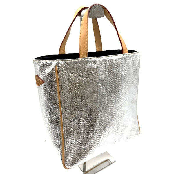 シルバーカラーが映える素敵なハンドバッグです。ヘリンボーン柄。レザーの匂いがあります。 サイド縁に汚れ、角擦れ、傷、ハンドルにシワがありますが壊れはなくまだまだご使用いただけるお品物です。