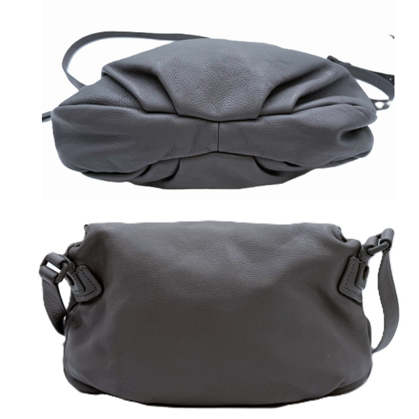 丸みのあるフォルムに仕切りのあるデザインが使いやすいショルダーバッグです。 表面にうっすら汚れ、サイドに色移り、内側ファスナー付近に黄ばみ、金具に傷、剥げが少々あります。 壊れはなくまだまだご使用いただけるお品物です。
