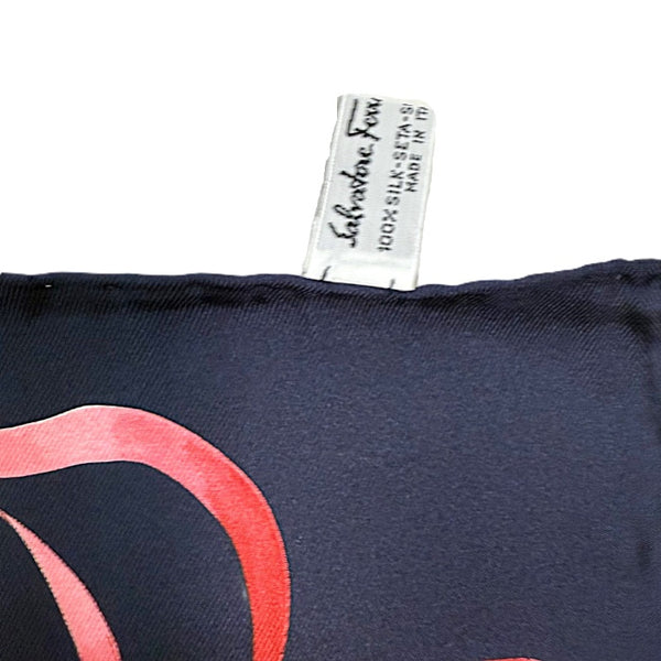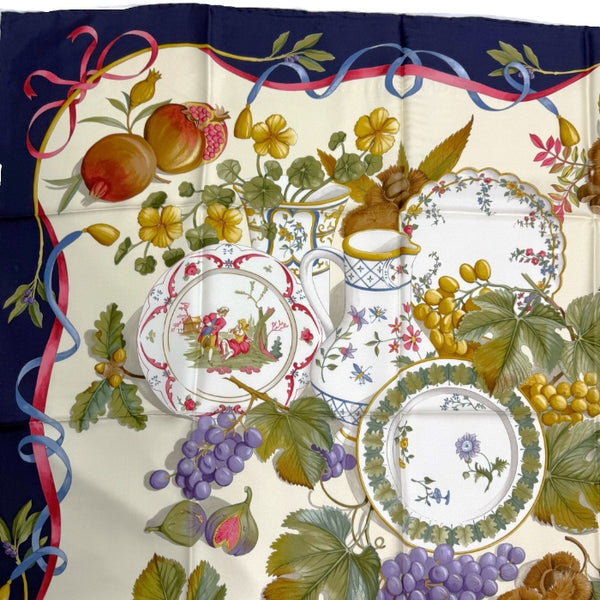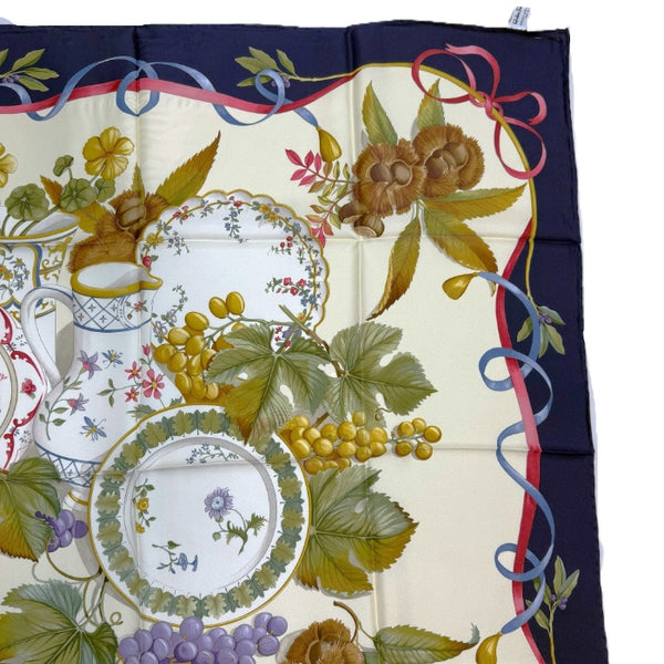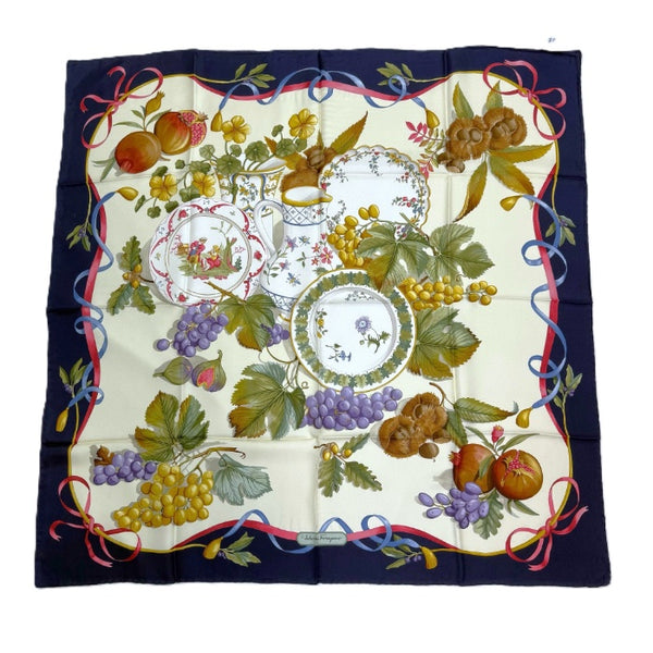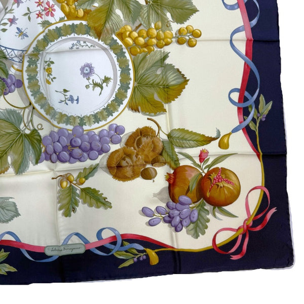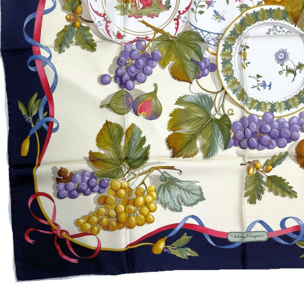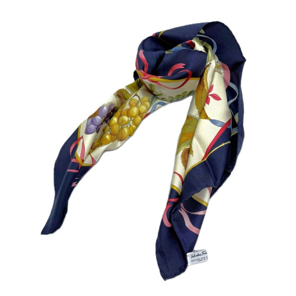 【中古】サルヴァトーレフェラガモ Salvatore Ferragamo スカーフ シルク 果物 食器柄 ネイビー アイボリー i0606aq02430
