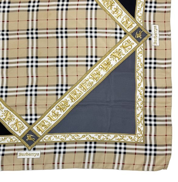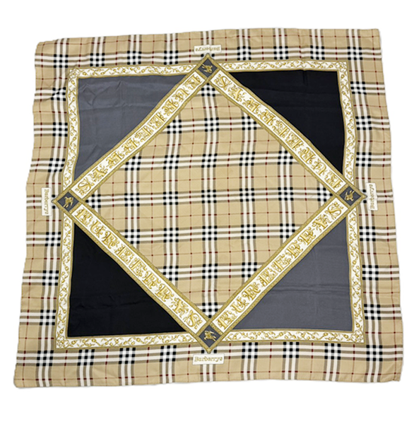 Burberrys(バーバリーズ)の人気ヴィンテージスカーフ。 ブランドを象徴するベージュ × ノバチェックに、クラシックなゴールド装飾デザインが施された上品な1枚です。 大判サイズで首元・バッグ・ヘアアレンジなど、多用途に活躍します。 シルク100%ならではの、なめらかで高級感ある手触りが魅力です。 目立つ汚れなく綺麗なお品です。