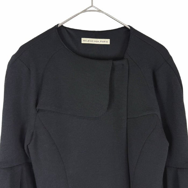 BALENCIAGA(バレンシアガ)のニットジャケットです。 立体的な切り替えデザインとフレアスリーブが印象的な一着。 ノーカラー仕様で、上品さとモード感を兼ね備えたデザインです。 ウール主体のしっかりとしたニット素材で、ジャケット感覚でもカーディガン感覚でも着用可能。 気になる汚れなく綺麗なお品です。