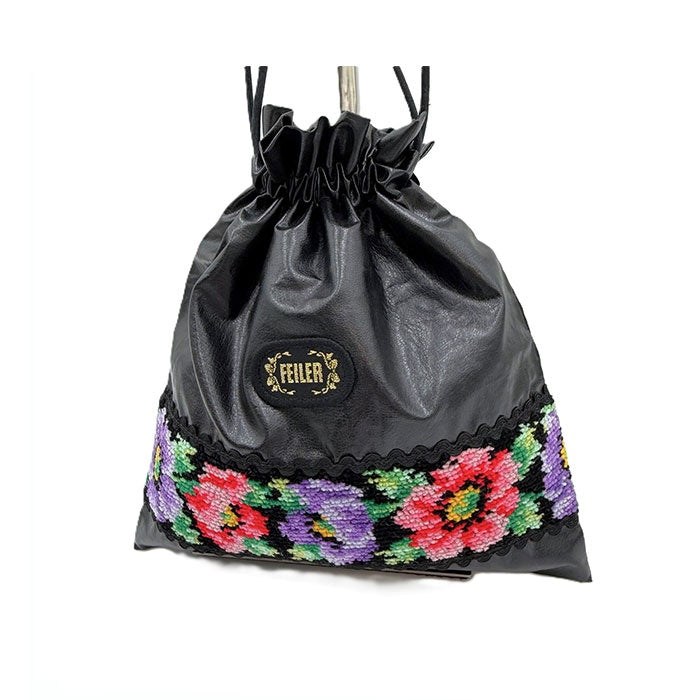 【中古】フェイラー FEILER ポーチ 巾着 レザー調 花柄 可愛い ブラック マルチカラー i0727tq0036