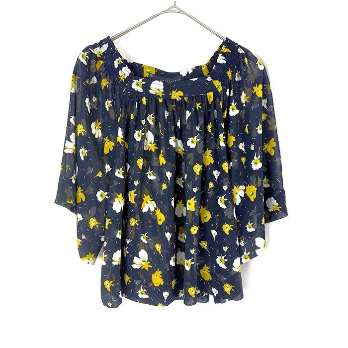 【中古】デプレ DES PRES 5分袖小花柄ブラウス 透け感 シアー バルーンスリーブ ブラック マルチカラー i0904n0075